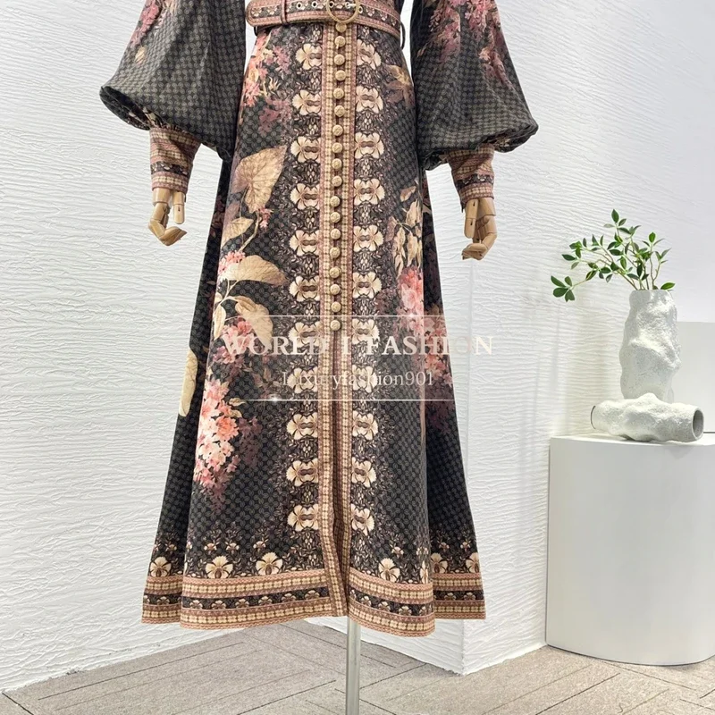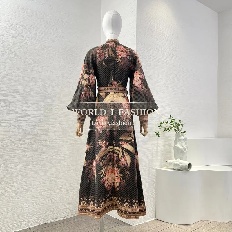 Pure Linen High Quality Latest New 2025 Black Floral Print Lantern Sleeve Belted Elegant Women Vacation Midi Dress