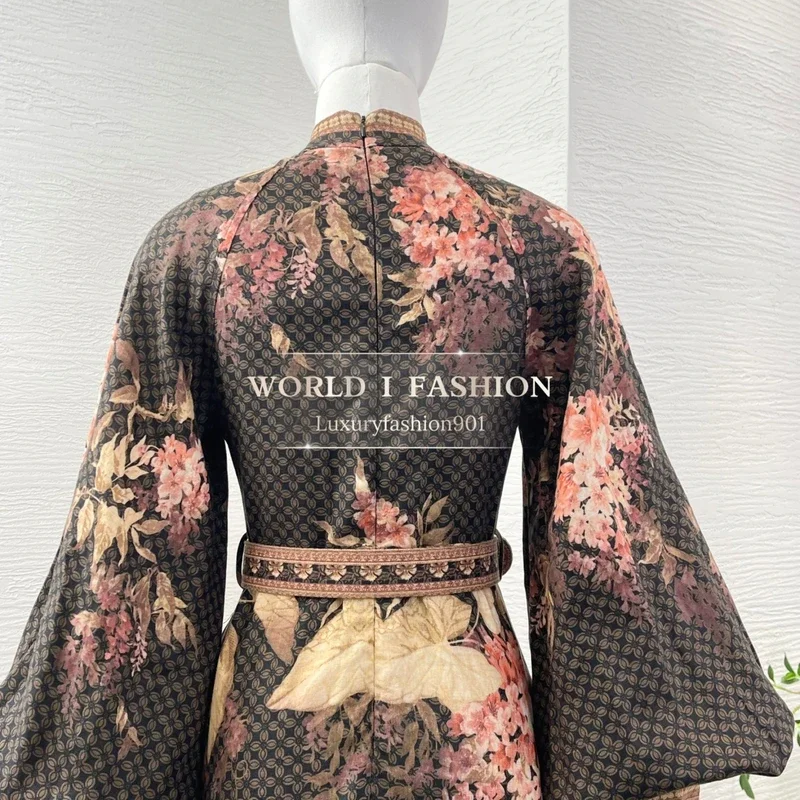 Be the first to review “Pure Linen High Quality Latest New 2025 Black Floral Print Lantern Sleeve Belted Elegant Women Vacation Midi Dress”