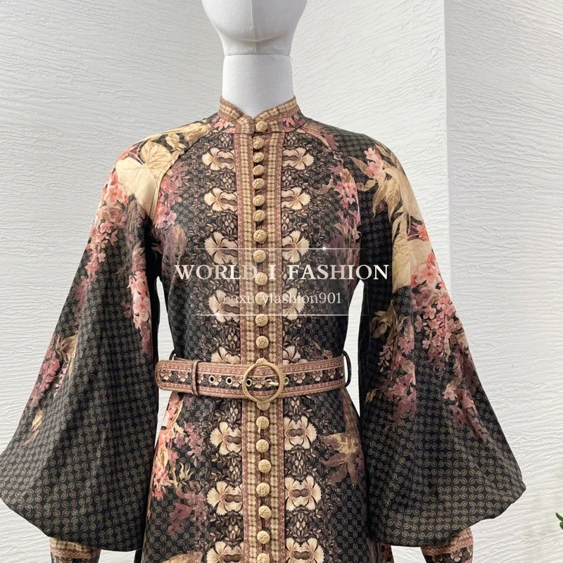 Buy Pure Linen High Quality Latest New 2025 Black Floral Print Lantern Sleeve Belted Elegant Women Vacation Midi Dress